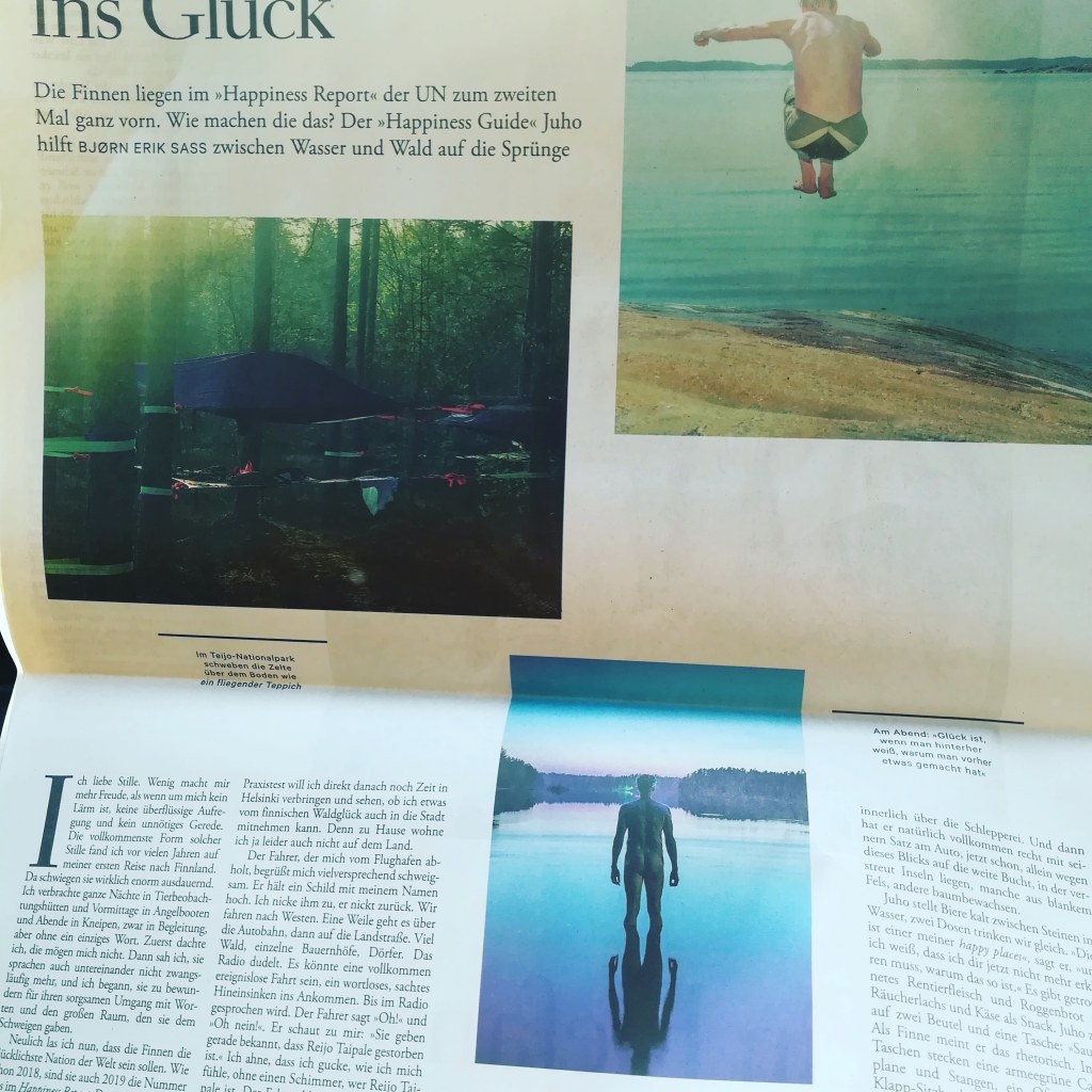 Originaleinleitung: Die Finnen liegen im „Happiness Report“ der UN zum zweiten Mal ganz vorn. Wie machen die das? Der „Happiness Guide“ Juho hilft Bjørn Erik Sass zwischen Wasser und Wald auf die Sprünge. Erschienen 2019 in DIE ZEIT
