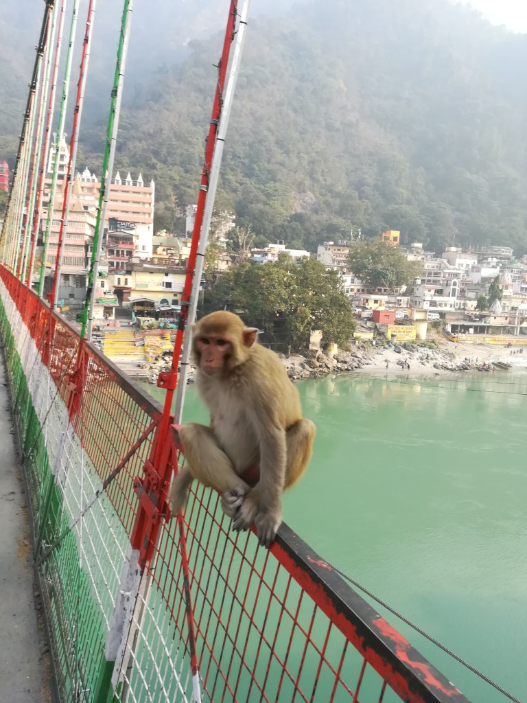 Ich laufe runter zum Fluss und überquere ihn auf einer stählernen Hängebrücke. Inder, westliche Besucher, alle drängen sich hier hin und her zwischen den beiden Dörfern Tapovan und Lakshman Jhula. Die Brücke ist so schmal, dass ich mit ausgestreckten Armen beide Seitengeländer berühren kann. Trotzdem nehmen auch Motorräder diesen Weg. Sie arbeiten sich hupend durch die Fußgänger, die gleichmütig Platz machen und weitergehen.