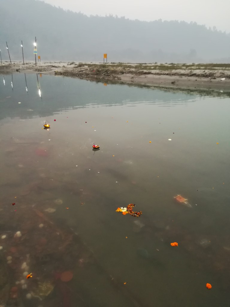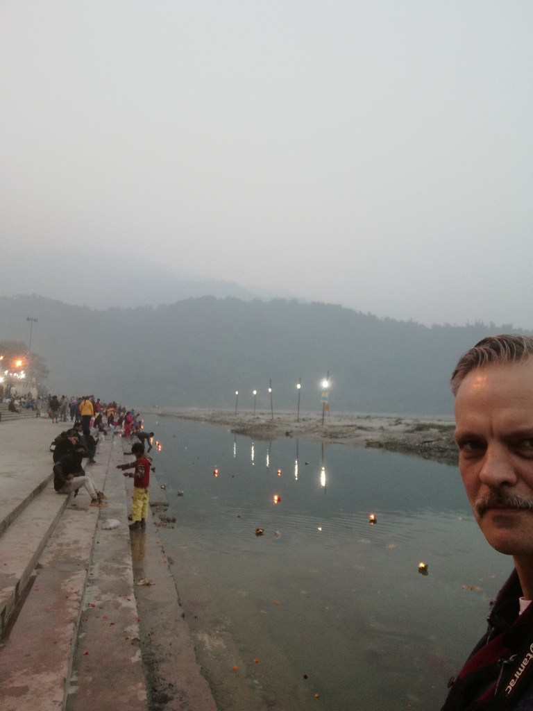 An meinem letzten Abend in Rishikesh stehe ich zum Sonnenuntergang am Ostufer. Eine halbe Stunde bevor sie hinter den Horizont sinkt, wird die Sonne orangerot und milchig. Mir kommt das vor wie ein sehr indisches Licht. Als Souvenir fülle ich Wasser aus dem Fluss in kleine Fläschchen, die es mit einem Om-Aufkleber überall für ein paar Cent zu kaufen gibt. Ziehe Stiefel und Socken aus und steige ein paar Schritte hinein.