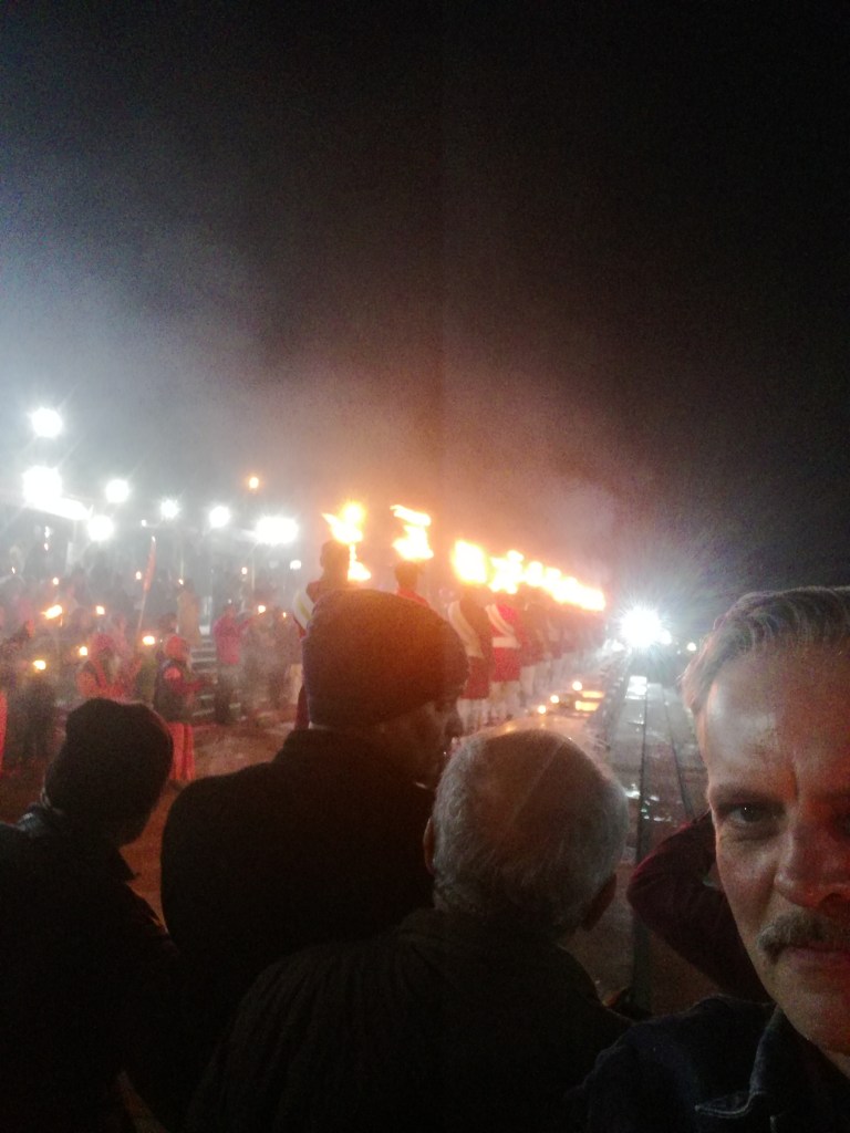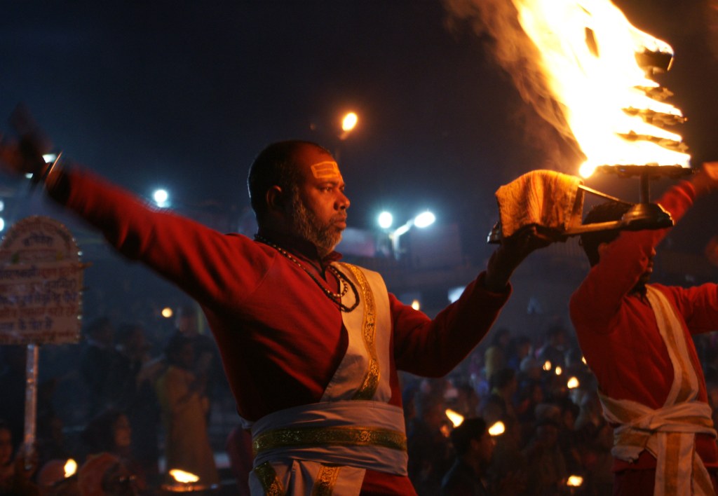 Zum Sonnenuntergang fahre ich ans Flussufer. Jeden Abend wird dort die Arti-Zeremonie gefeiert, mit der sie den Ganges ehren, den sie die Ganga nennen und der für sie eine göttliche Mutter ist, weil er die große Ebene im Süden fruchtbar macht. Diese Inbrunst, mit der sie ihre Öllampen im Gleichtakt schwenken, mit der die Band spielt, die verbrannten Gewürze in der Luft, die großen Augen der Zuschauer, fast nur Inder, die kleinen Schiffchen aus eng verflochtenen Blättern mit Blüten und einer brennenden Kerze darin, die dem Fluss als Opfer gebracht werden: Die Zeremonie dauert eine Stunde, und genauso lange habe ich einen Kloß im Hals.