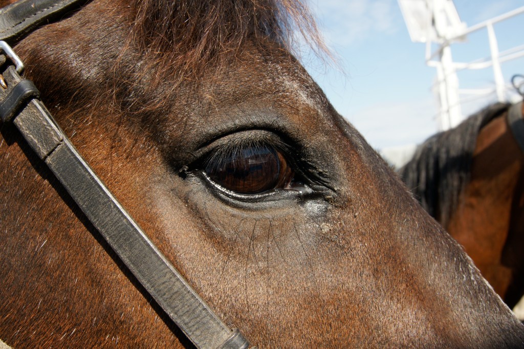 Wir tüdeln unsere Pferde zurecht. Offiziell binden wir Regenjacken hinter die Sättel und stellen die Steigbügelhalter passend, aber vor allem wollen wir sehen: Wer trägt mich da ab jetzt eine Woche lang? Und wie machen wir uns am besten miteinander bekannt? Die Schweizerinnen sprechen mit ihren Pferden. Da ist viel von „Süße“ und „Schöne“ und „Kleine“ die Rede. Das variiere ich, wir sind ja beides Kerle. Ich sage „Hallo“ zu meinem Pferd, wir schauen uns gründlich in die Augen, und mein Pferd wackelt schnell hintereinander mit seinen Ohren: rechts, links, rechts, links. Ich werte das als zustimmendes Signal, Lkw-Fahrer bedanken sich ja auch blinkend auf diese Weise, wenn ihnen nach dem Überholen eine Wiedereinfädellücke in die rechte Spur angezeigt wird. Mehr zu reden fällt mir nicht ein. Sandra und Keith haben statt vieler Worte Obst mitgebracht. Keith streckt seinem Pferd einen Apfel hin und sagt nur: „Nimm ihn als Bestechungsversuch für eine gute Woche. Oder einfach als Apfel.“