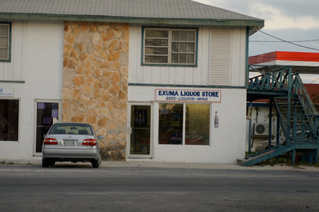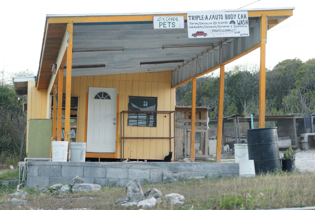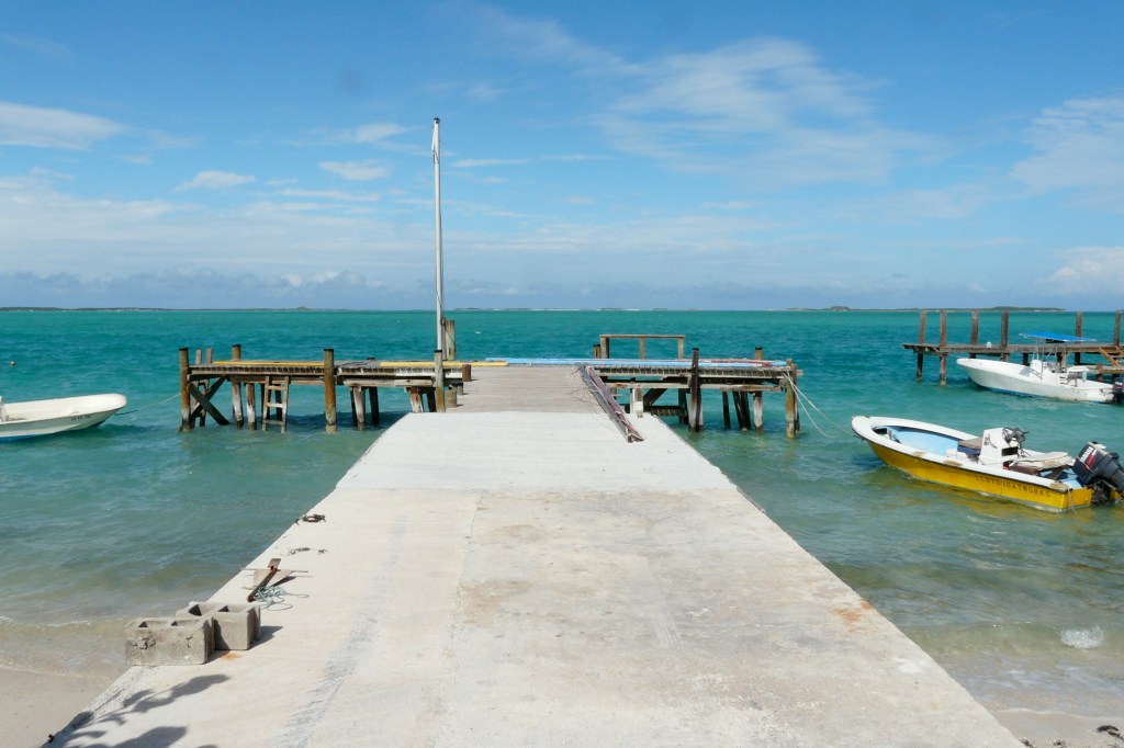 Für den Bootstrip habe ich Pat angeheuert. Angeblich ist er einer der erfahrensten Pig-Watch-Skipper des Archipels. Zur Einschiffung treffe ich im Hafen von Barreterre im Nordosten der Hauptinsel Great Exuma ein. „Hafen“ ist eventuell irreführend. Es gibt einen 20 Meter langen Steg, ein Willkommensschild, gestiftet von der Barreterre Development Association, eine betonierte Sliprampe und eine gezimmerte Bar ohne Seitenwände. Einmal in der Woche legt das Postschiff aus Nassau an. Dazwischen passiert nicht viel in Barreterre. Einen Skipper mit Boot sehe ich noch nicht. In meinem Diensteifer habe ich mich überpünktlich herfahren und dafür das Frühstück ausfallen lassen. Das ist mit Blick auf Seefestigkeit sicher nicht hilfreich.