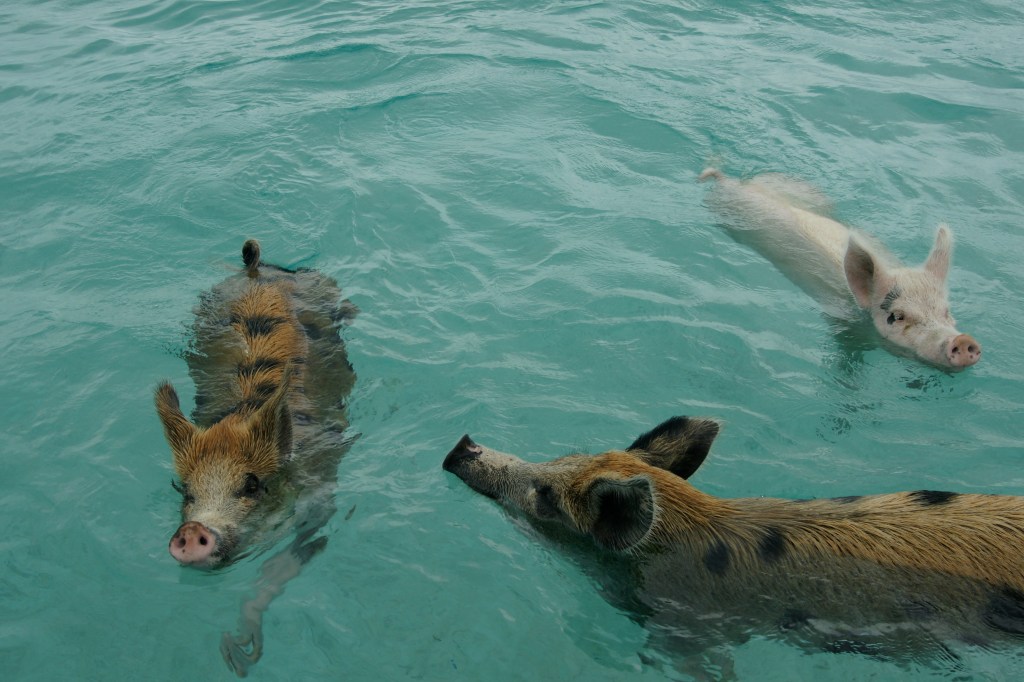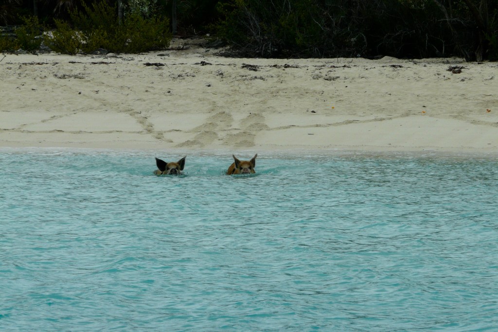 Ich will die Herren nicht ärgern und lenke darum lieber auf mein Lieblingsthema: Was ist denn mit den Schweinen, wart ihr schon mal da draußen? „Natürlich, es gibt großartige Conch-Bänke da draußen!“ Und wie sind die Schweine? „Genau wie andere Schweine auch.“ Das habe ich mir doch gedacht, jetzt fliegt der Schwindel auf. „Außer dass diese schwimmen.“ Und die leben da ganz allein, ohne Hirten oder so was? „Die werden schon nicht abhauen, oder?“ Und wovon leben die? „Von dem, was Leute wie du ihnen geben, und von dem, was da eben so wächst.“