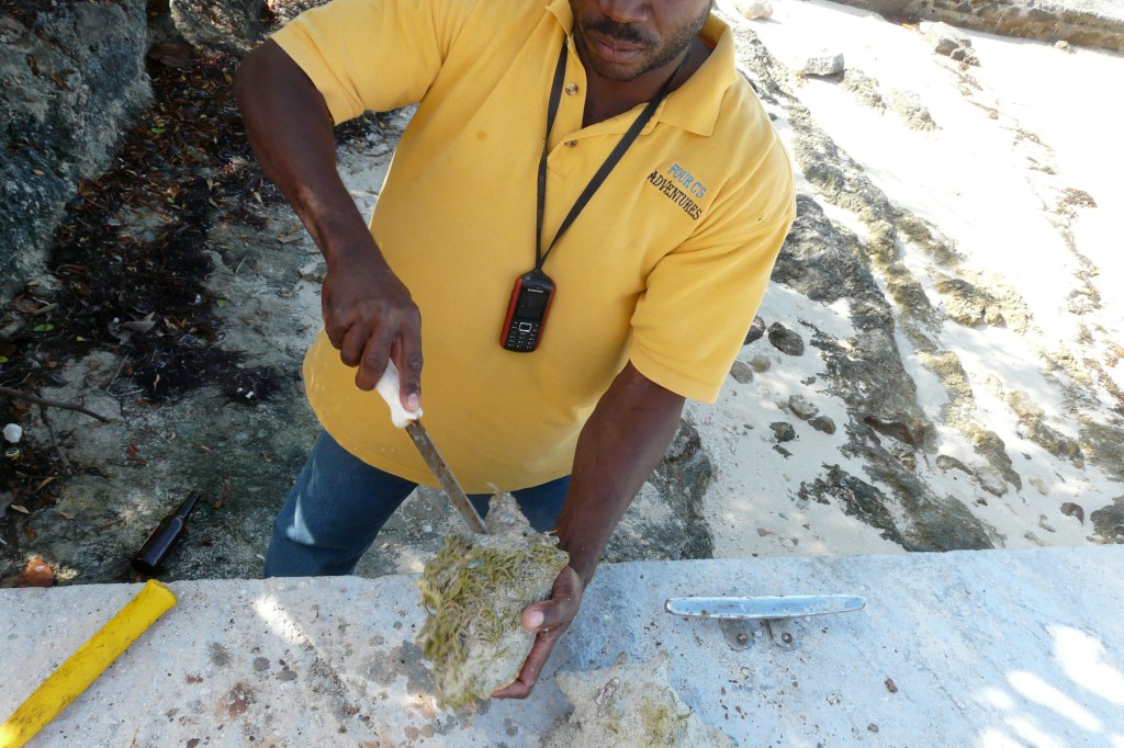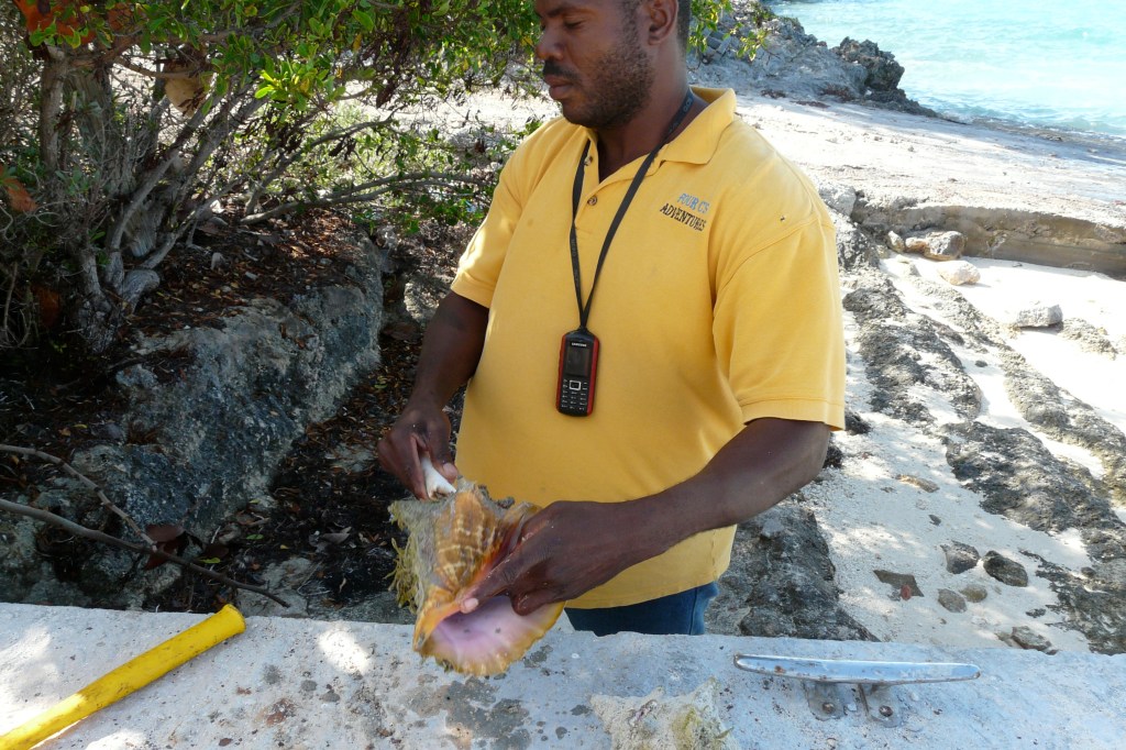 Wir ankern an einer sichelförmigen Sandbank in einem Sund zwischen einigen Inseln. Hier liegen schon ein paar Boote. Die Passagiere schnorcheln oder gehen spazieren. Der Sand ist so weiß, das Wasser davor so fies türkis, dass ich mich frage, wie ich je wieder an einem Ostseestrand glücklich sein kann. Pat macht für mich Conch-Salat. Mit einem Hammer schlägt er leicht aufs Gehäuse. Vor Schreck zieht sich die Schnecke innen zusammen, Pat schiebt ein Messer hinein und bekommt durch die enge Öffnung das Tier zu fassen und zieht es heraus. Ein zwei Hände großes, zuckendes Ding liegt da. Das Fleisch ist weiß, oben hängt was dran, das aussieht wie ein nickender brauner Papageienschnabel. In einer Muskelfalte steckt eine Art Glasnudel-Makkaroni. Pat bietet mir eine an. „Salziger Gummibär!“ Hilft bestimmt auch bei irgendwas.