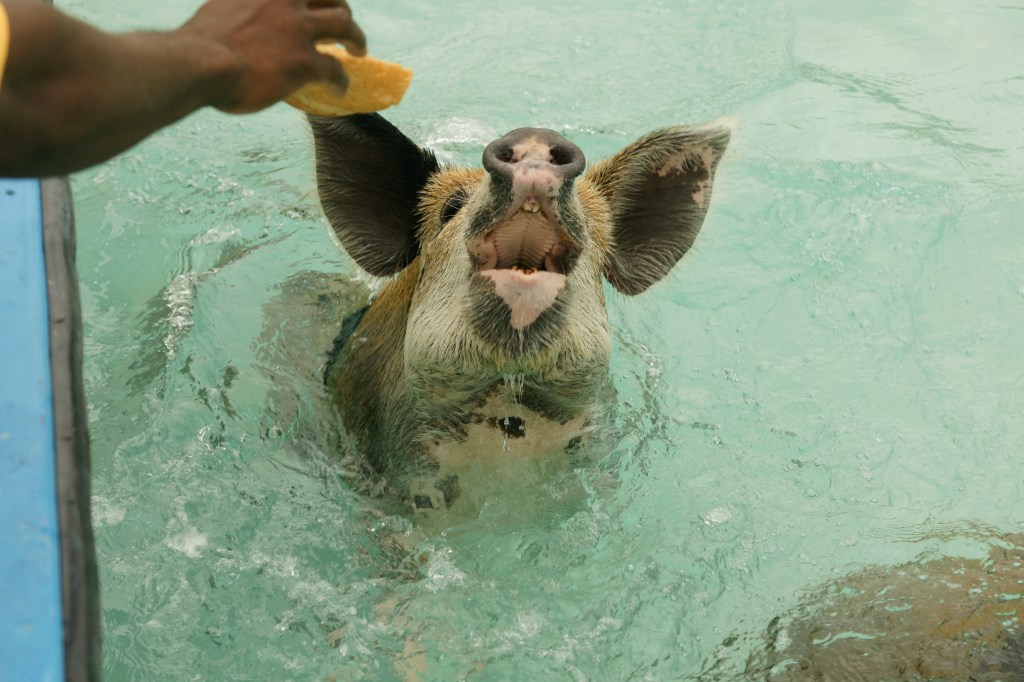 Wir passieren ein Inselchen, das komplett hohl ist, unter der Wasseroberfläche gibt es einen Einstieg für Taucher: die Thunderball-Grotte aus dem James-Bond-Film. Dann biegen wir um eine felsige Landzunge und halten auf den Strand von Big Major Cay zu. Hier sollen sie sein. Sie kommen uns auch schon entgegen, und zwar tatsächlich: geschwommen, Ringelschwanz und Rüsselschnauze in die Höhe. Sie paddeln wie Hunde. Strampeln und schnauben und grunzen. Vom Ufer aus sieht ein halbes Dutzend Ferkel zu. Die Viecher sind nun längsseits angekommen. Drei Säue, eine in Rosa, die beiden anderen in geschmackvollem Kamelbeige mit dunkelbraunen Punkten. Keine Ahnung, was das für Rassen sind. Normale Hausschweine, sagt Pat. Der verteilt jetzt Brot und Gemüsereste. Wie geht Herkunftstheorie Nummer drei?, frage ich. „Die Schweine gehören Bewohnern von Staniel Cay nebenan, die bringen sie hierher, damit sie fressen: von dem, was sie finden, und dem, was wir ihnen geben. Und wenn sie fett genug sind, gibt es ein Grillfest.“ Diese Theorie klingt für mich am unromantischsten.