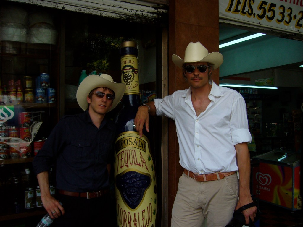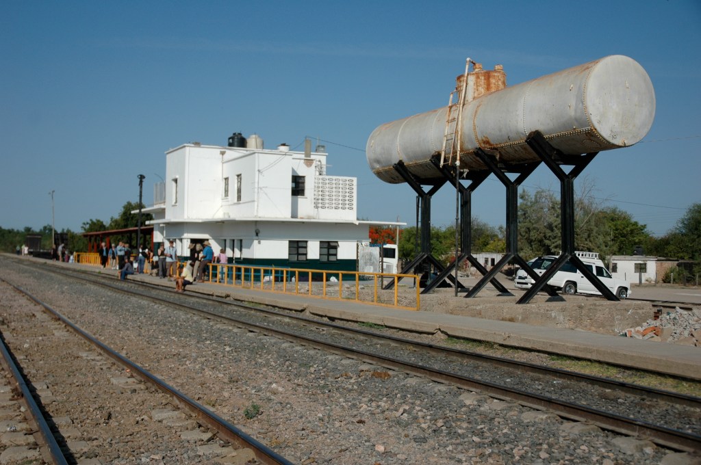 Das Warten gehört hier also endlich mal wieder zum Reisen. Weil es schon sehr früh sehr heiß wird, suche ich Schatten. Neben den Gleisen steht ein haushoher Wasserspeicher. Von irgendwo dort oben tropft es. Immer auf die gleiche Stelle am Boden. Und so überlege ich, ob ich mich unter diese Tropflinie stellen soll. Dann könnte sich das Wasser in der Krone meines nagelneuen Hutes – Modell Saddle King – sammeln. Das ewig gleiche Platschen der Tropfen fast direkt auf mein Hirn würde mich herrlich einlullen, bis ich dann nach einer Weile den Hut vorsichtig abnehmen, zum durstigen Munde führen und die Pfütze austrinken würde. Das wäre ziemlich lässig vor meinen Mitwartenden. Denn so macht es einer der Banditen im Wildwestfilm „Spiel mir das Lied vom Tod“, während sie auf den Zug mit Charles „Mundharmonika“ Bronson warten und derweil, genau wie ich jetzt hier in El Fuerte, die hitzewabernde Schienentrasse abwechselnd in beide Richtungen hinunterstarren, wo sie sich irgendwann in dem bisschen Busch und in den fahlen Wüstenfarben verliert.