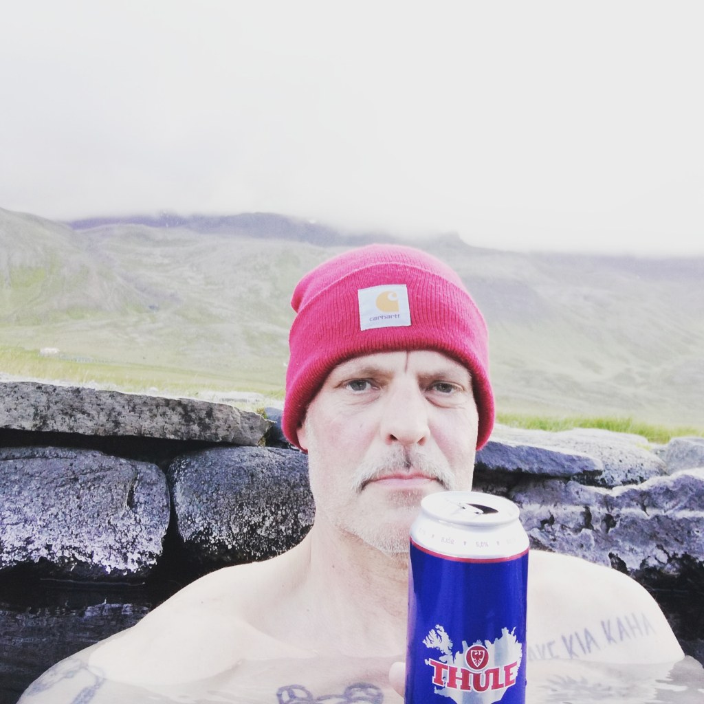 Grettislaug ist ein künstlicher Pool, in dem Thermalquellwasser mit kaltem Wasser aus einem nahen Bach auf badefähige Temperatur gemischt wird, gebaut aus dicken Steinen, brusttief, mit Steinbänken an den Innenseiten. Er liegt auf Bauernland, der Besuch kostet 1000 Kronen, zur Feier des Tages gönne ich mir ein Bier, noch mal 1000 Kronen, zusammen rund 15 Euro, der Bauer akzeptiert lächelnd auch Kreditkarten. Nach drei herrlich ruhigen Fahrtagen in 40 Grad Celsius revitalisierend, habe ich nichts zu meckern. Die Dame eines mittelalten deutschen Paares hat sich ihre Fähigkeit zu kritischem Denken dagegen noch nicht wegdampfen lassen und moniert den Algenbewuchs auf den Einstiegsstufen als Unfallgefahrenherd, die Sitzbänke als nicht passgenau für Kleinwüchsigere und wünscht sich eine Ablagemöglichkeit für ihr Telefon in Griffweite vom Pool, jedoch spritzwassergeschützt. Das brabbelt sie auf ihren Kerl nieder, doch der sitzt nur im Wasser und reagiert null. Mir geht das irgendwann auf den Senkel. Ich gehe mir ein neues Bier holen. „Aufpassen, das Geländer wackelt“, warnt sie mich beim Ausstieg, aber ich gebe nicht zu erkennen, dass ich Deutsch verstehe.