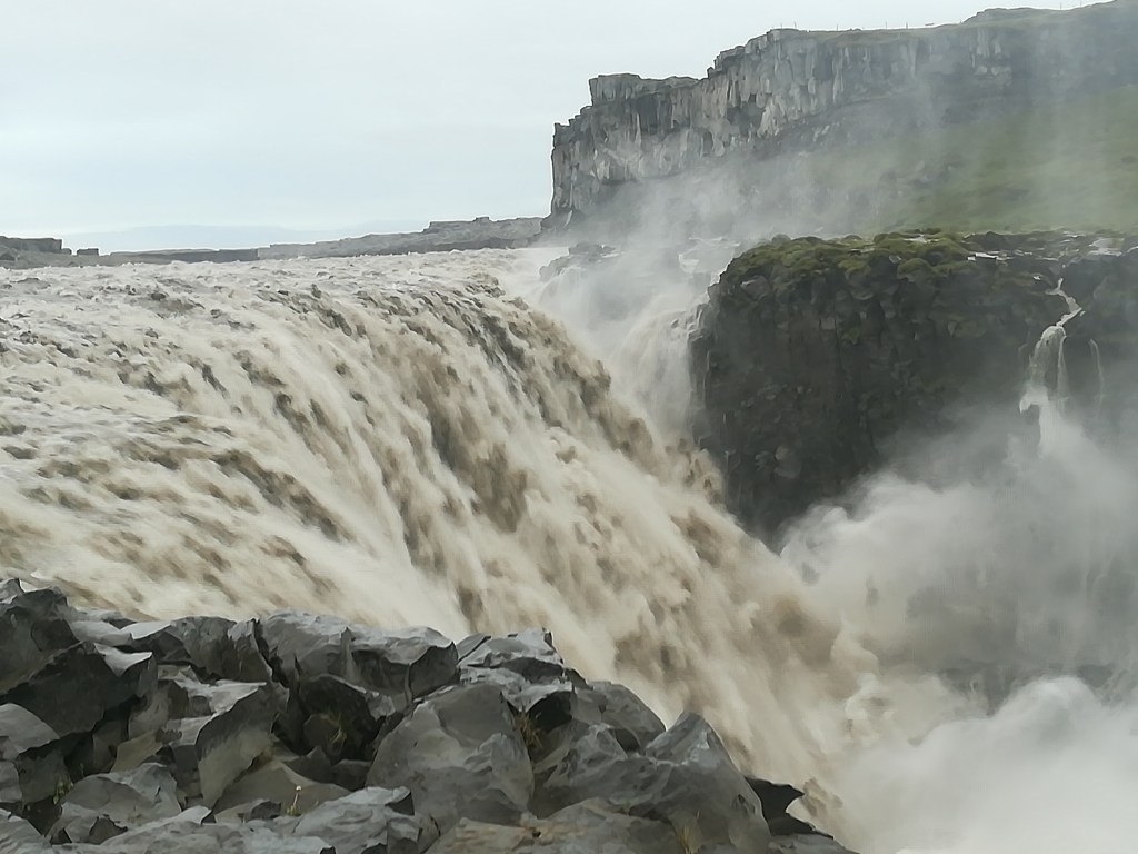 Gebeutelt von diesem Erlebnis und begierig, es in möglichst intensivem Kontakt mit der Natur zu vergessen, mache ich einen blöden Fehler: Ich fahre zum Godafoss-Wasserfall. Der soll sehr beeindruckend sein. Er ist auch sehr beeindruckend. Aber er liegt ganz nah an der Ringstraße und nahe an Akureyri. Ich zähle fast 20 Reisebusse, dazu Pkw und Wohnmobile sonder Zahl. Dichtes Gedränge auf den asphaltierten Fußwegen und am Rand des Falles. Niemand setzt sich hin und guckt bloß. Dabei ist der Wasserfall wirklich wunderschön. Es braust der Fluss vor seinen Schnellen, es brodelt die Gischt, es leuchten Regenbogen darin. Aber hat man sich solchen Orten nicht früher andächtig genähert, ihre Schönheit nach und nach in sich einsickern lassen, vielleicht bei einem Picknick? Im Wegfahren denke ich an den Film Apocalypse Now. Darin steigen zwei Männer einmal von ihrem Boot an Land, um Mangos zu pflücken. Ein Tiger erschrickt sie. „Niemals das Boot verlassen“ ist ihre Lehre; „Niemals den Arctic Coast Way verlassen“ sollte meine sein.