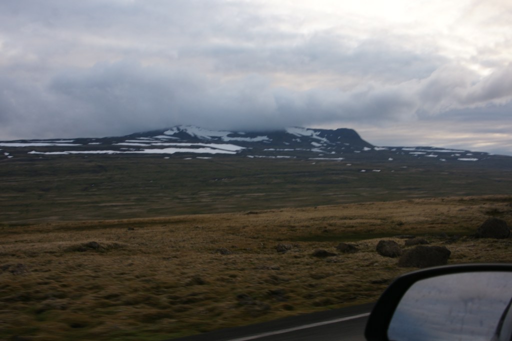 Ich befahre den Nordurstrandarleid also von West nach Ost, von Hvammstangi bis Vopnafjördur. Eine Woche habe ich dafür. Vom Flughafen Keflavík tief im Südwesten des Landes rolle ich nach Norden. Bei Borgarnes bekomme ich Appetit und steuere eine Tankstelle mit Shop an. Ich finde eine Gaskartusche für meinen Campingkocher und einige Konserven, um in den nächsten Tagen autark zu sein. Dann esse ich einen Hotdog, draußen, an meinen Wagen gelehnt. Ich schaue auf einen tiefgrauen Fjord unter dichtem, tiefgrauem Himmel, dahinter Berge, schroff, dunkel, in der Ferne auch schneebedeckt, und die Luft ist gleichzeitig klar und gedämpft von der Schwere der Berge und des Himmels.