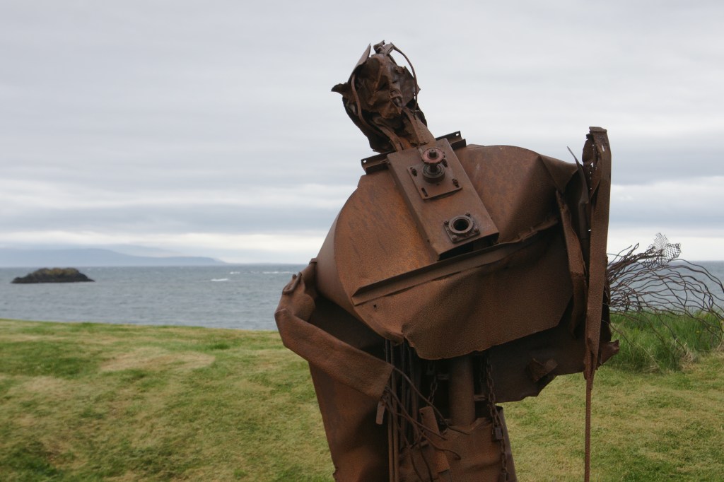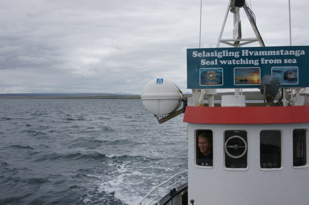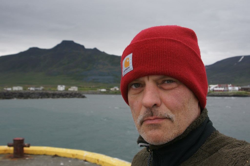 Wenn ich auf Vatnsnes schon dachte, ist aber geistbefreiend reduziert hier, ist die nächste Halbinsel Skagi noch weiter, rauer, leerer. Im Ort Skagaströnd schlafe ich zum ersten Mal im Zelt, und der Wind fährt so schick über die Plane, dass ich mich fühle wie sanft in einer Wiege geschaukelt. Morgens steige ich auf den Berg hinter dem Dorf. Von da erkenne ich die Ostküste der Westfjorde noch besser als gestern. Lange schaue ich nicht hinüber. Obenrum lediglich bekleidet mit langem Unterhemd, Hemd, Fleece, Jacke und Windjacke, wird mir beizeiten frisch im brüllenden Wind, trotz milder 10 Grad Celsius.